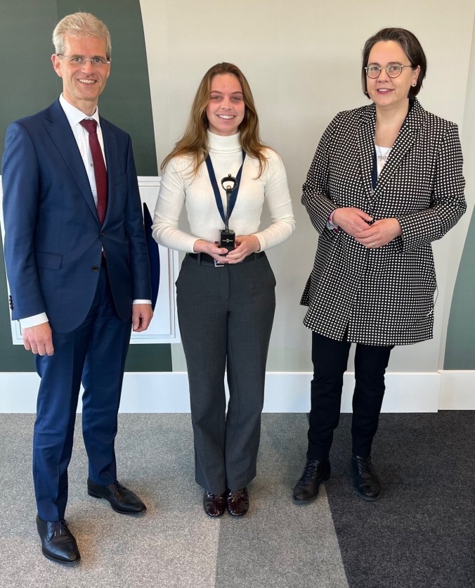 Op de foto v.l.n.r.: Arnold Weggeman (voorzitter SBLO), Camille Teirlynck (prijswinnaar) en Renée van Schoonhoven (Vrije Universiteit Amsterdam).